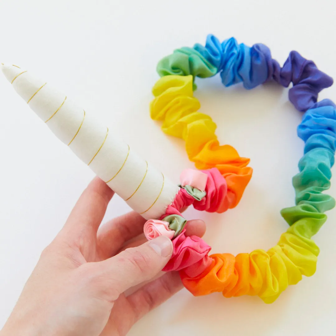 Rainbow Unicorn Headbands are a 5 inch natural mulberry silk unicorn horn is enhanced with golden thread, attached to an 18 inch elastic garland for secure, comfortable wear. Fits comfortably on even the most sensitive little ones.