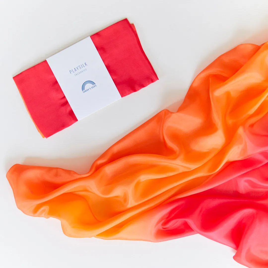 Fire Playsilks are painted by hand on 35 x 35-inch squares made from gorgeous, lightweight (5 momme) 100% pure mulberry silk.
