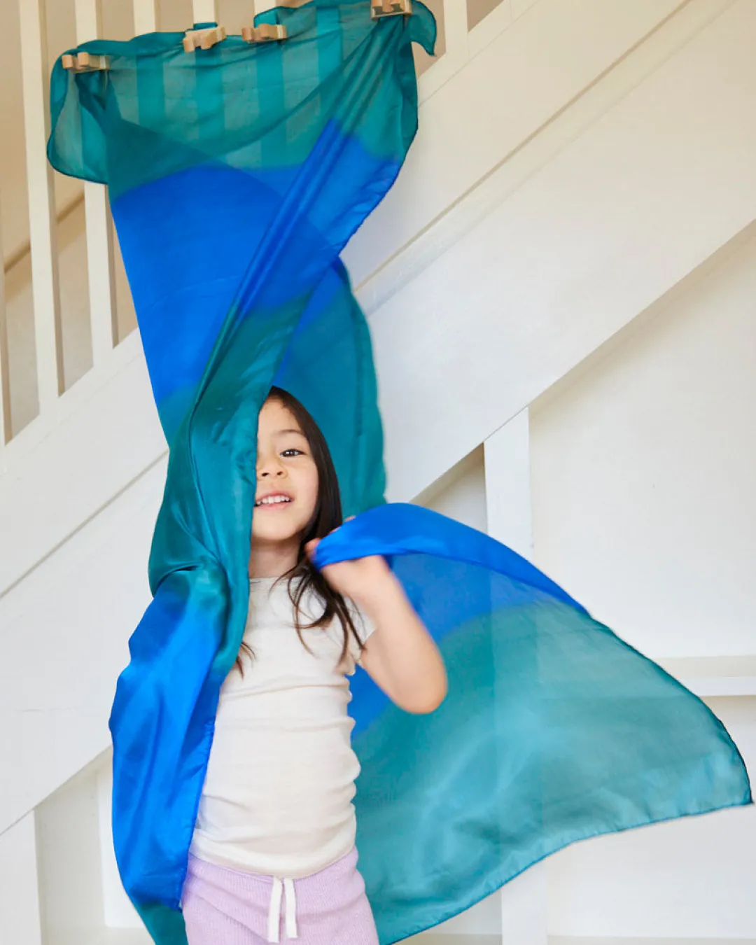 Our Fort Kits make fort build fun and easy! Ocean Fort kits include a Giant Ocean Playsilk and four Playclips. Give your child the gift of creating their own playspace with our Fort Kits – they work wonderfully well simply using furniture in your home, a favorite tree outdoors, or you may even prefer to use our Waldorf Playstand for maximum for building fun!