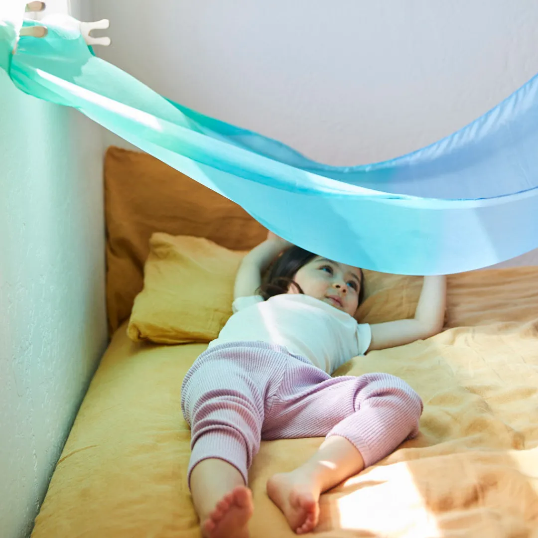 Our Fort Kits make fort build fun and easy! Sea Fort kits include a Giant Sea Playsilk and four Playclips. Give your child the gift of creating their own playspace with our Fort Kits – they work wonderfully well simply using furniture in your home, a favorite tree outdoors, or you may even prefer to use our Waldorf Playstand for maximum for building fun!