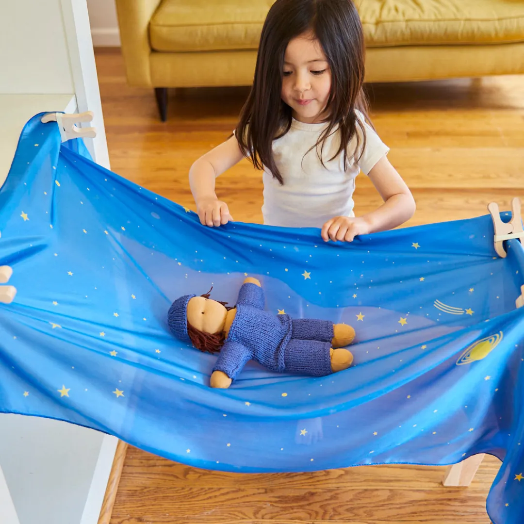 Our Fort Kits make fort build fun and easy! Star Fort kits include a Giant Star Playsilk and four Playclips. Give your child the gift of creating their own playspace with our Fort Kits – they work wonderfully well simply using furniture in your home, a favorite tree outdoors, or you may even prefer to use our Waldorf Playstand for maximum for building fun!