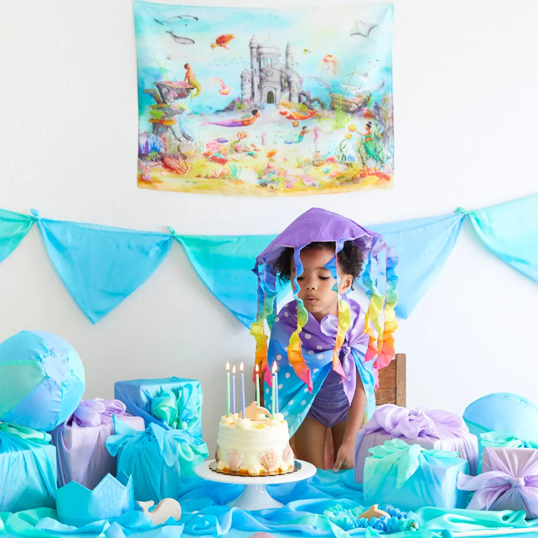 Introducing our NEW Jellyfish Dress-up Set! The Silk Jellyfish Hat is comfortable, versatile, and is a must-have addition to any undersea explorers dress up box. Little ones are able to easily slip them on and off all by themselves and wear them with the Rainbow Jellyfish Playsilk. A beautiful addition to any open ended play collection.