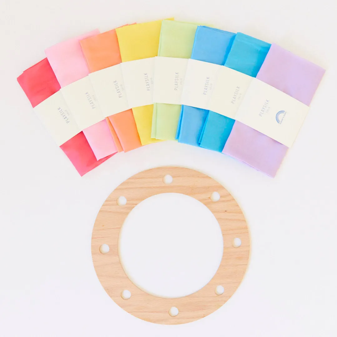 - 8 Playsilks in colors Rose, Pink, Peach, Yellow, Lime, Sky, Turquoise and Lavender (all solid color Playsilks measure 35″x35″)