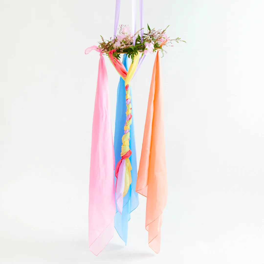 - 8 Playsilks in colors Rose, Pink, Peach, Yellow, Lime, Sky, Turquoise and Lavender (all Playsilks measure 35″x35″)