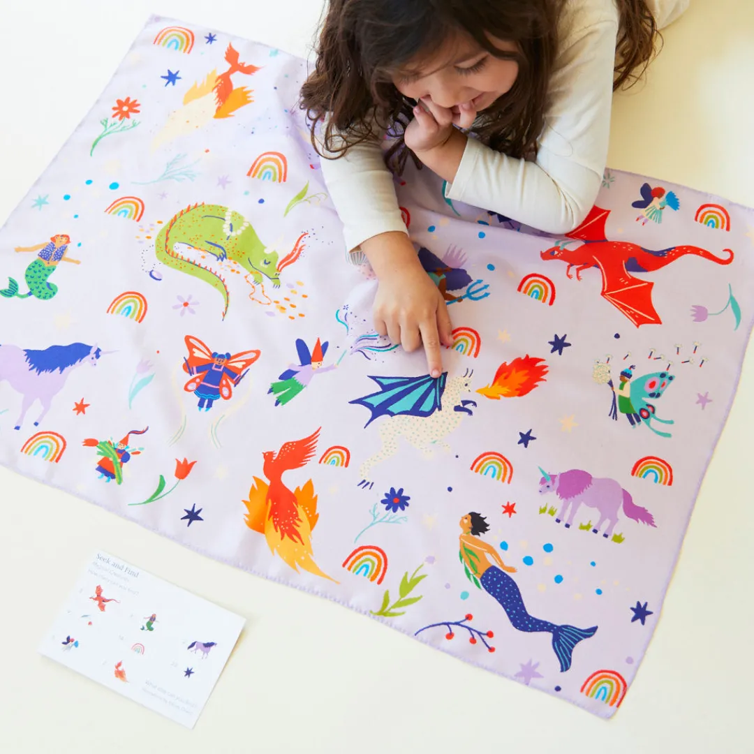 Seek & Find Playsilks are made in collaboration with different artists. The Magical Creatures Seek & Find features artwork by Kelsey Oseid, you can find their work on Instagram @kelzuki