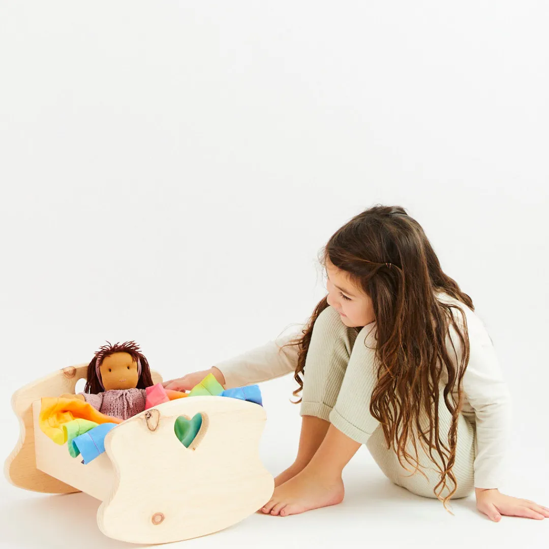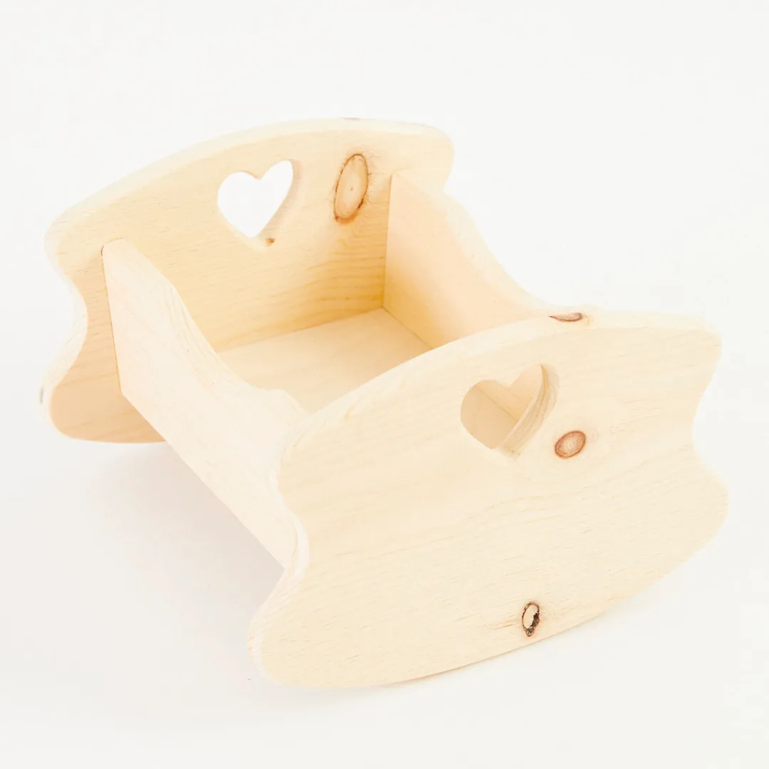 Our Wooden Doll Cradle is handcrafted from natural pine wood and will be used to create a cozy resting place for your child’s special doll. Hand-cut and sanded heart cutouts will add beauty to this heirloom toy.