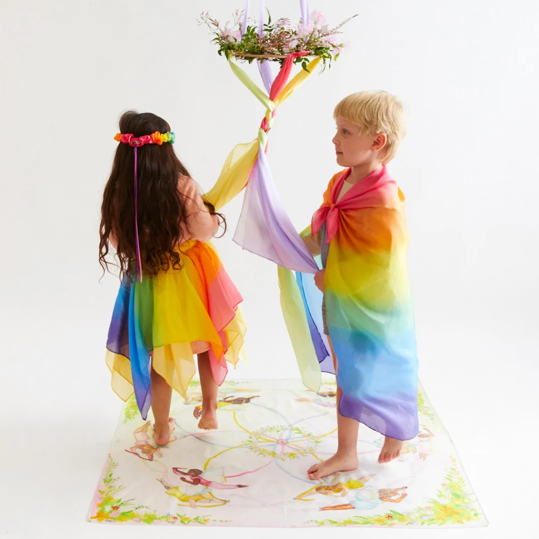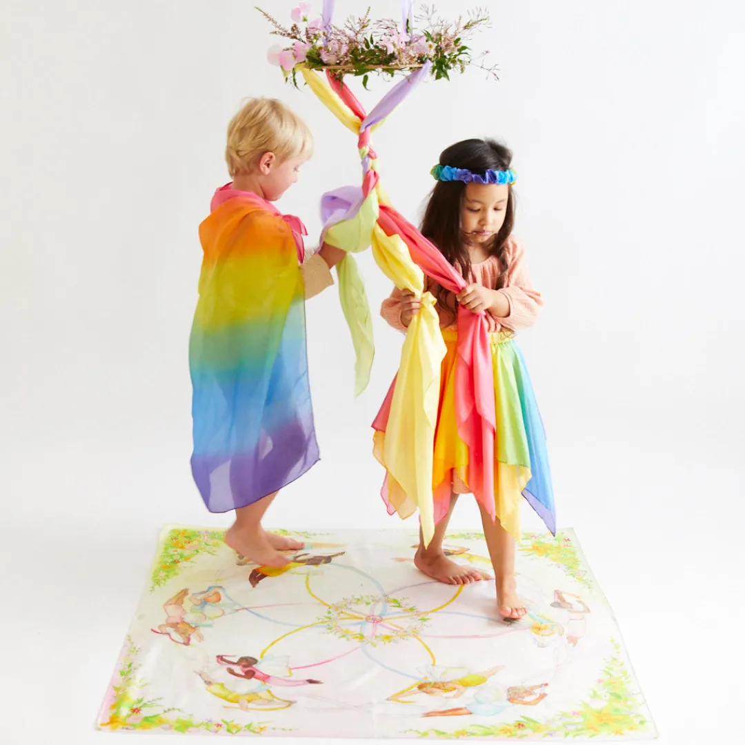 This limited edition celebration Playsilk comes in three sizes – Mini for small world play and nature tables, Playsilks to wear as a cape or laying down on the floor to practice Maypole dancing, and Large for hanging on classroom and playroom walls or for gathering around as a group.
