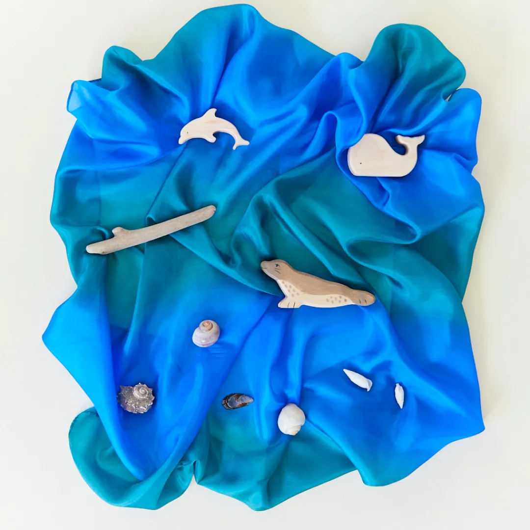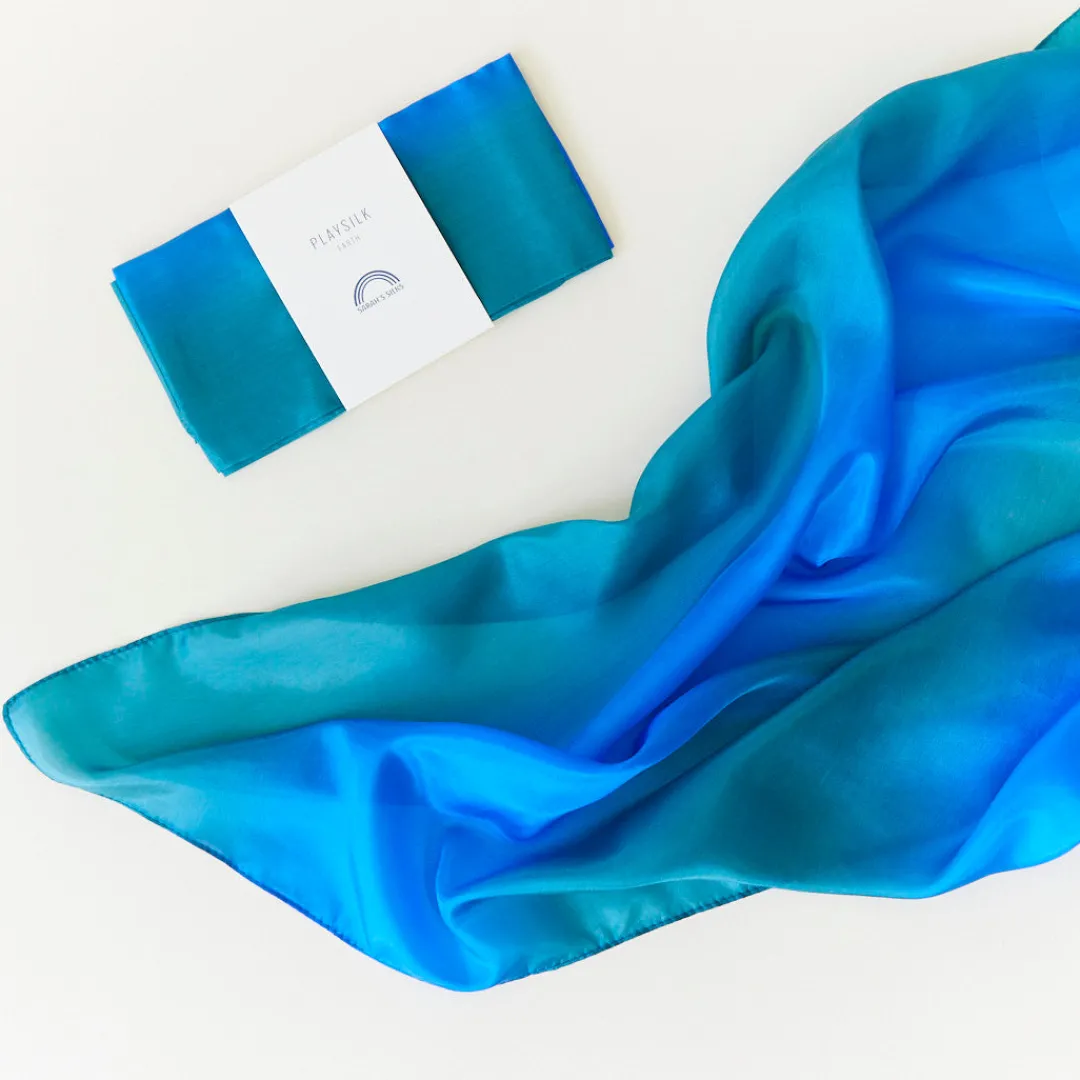 Ocean Playsilks are painted by hand on 35 x 35-inch squares made from gorgeous, lightweight (5 momme) 100% pure mulberry silk.