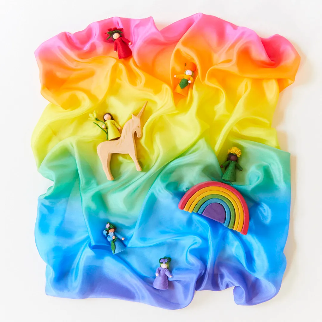 Rainbow Playsilks will be used for anything your child can imagine! Learn the rainbow order, explore the joy of color matching, tie a rainbow cape, care for your doll with a rainbow doll blanket, wrap a rainbow skirt, and so much more! Rainbow Playsilks are painted by hand on 35 x 35-inch squares made from gorgeous, lightweight, 100% pure mulberry silk.