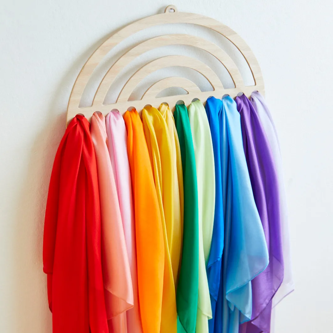 Our large Playsilk Display option for homes and classrooms. Simply hang on a wall and slip your Playsilks through! Easy and fun for children learning to care for their toys and encourages young ones to keep playrooms tidy.