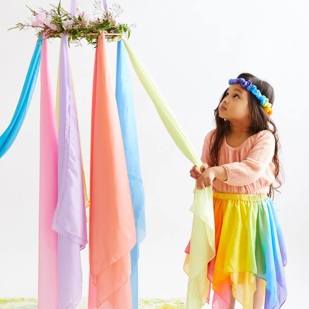 This limited edition celebration Playsilk comes in three sizes – Mini for small world play and nature tables, Playsilks to wear as a cape or laying down on the floor to practice Maypole dancing, and Large for hanging on classroom and playroom walls or for gathering around as a group.