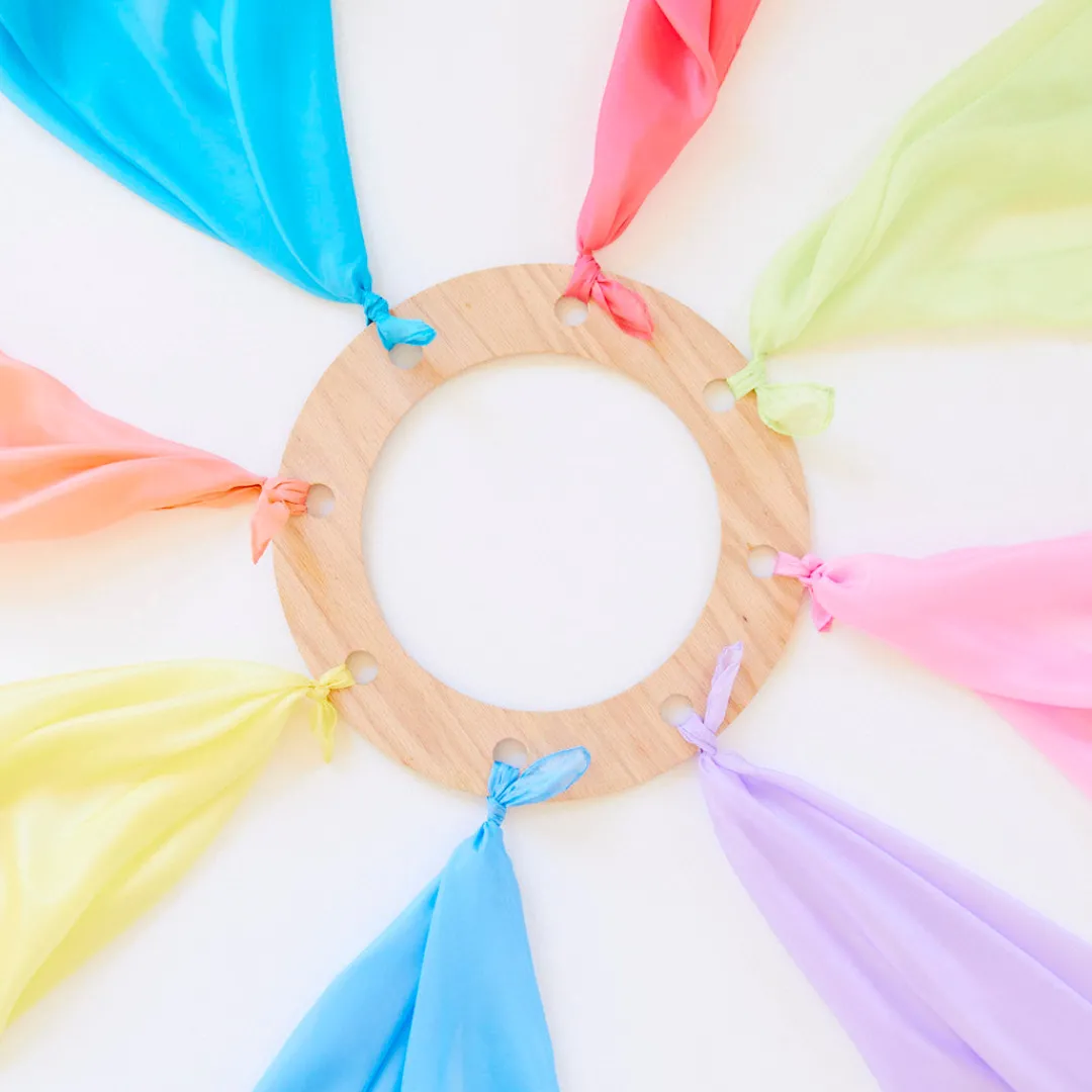 Our May Day Ring is a simple and beautiful May day option! Tie Playsilks through the holes and have the children dane and skip in a circle.