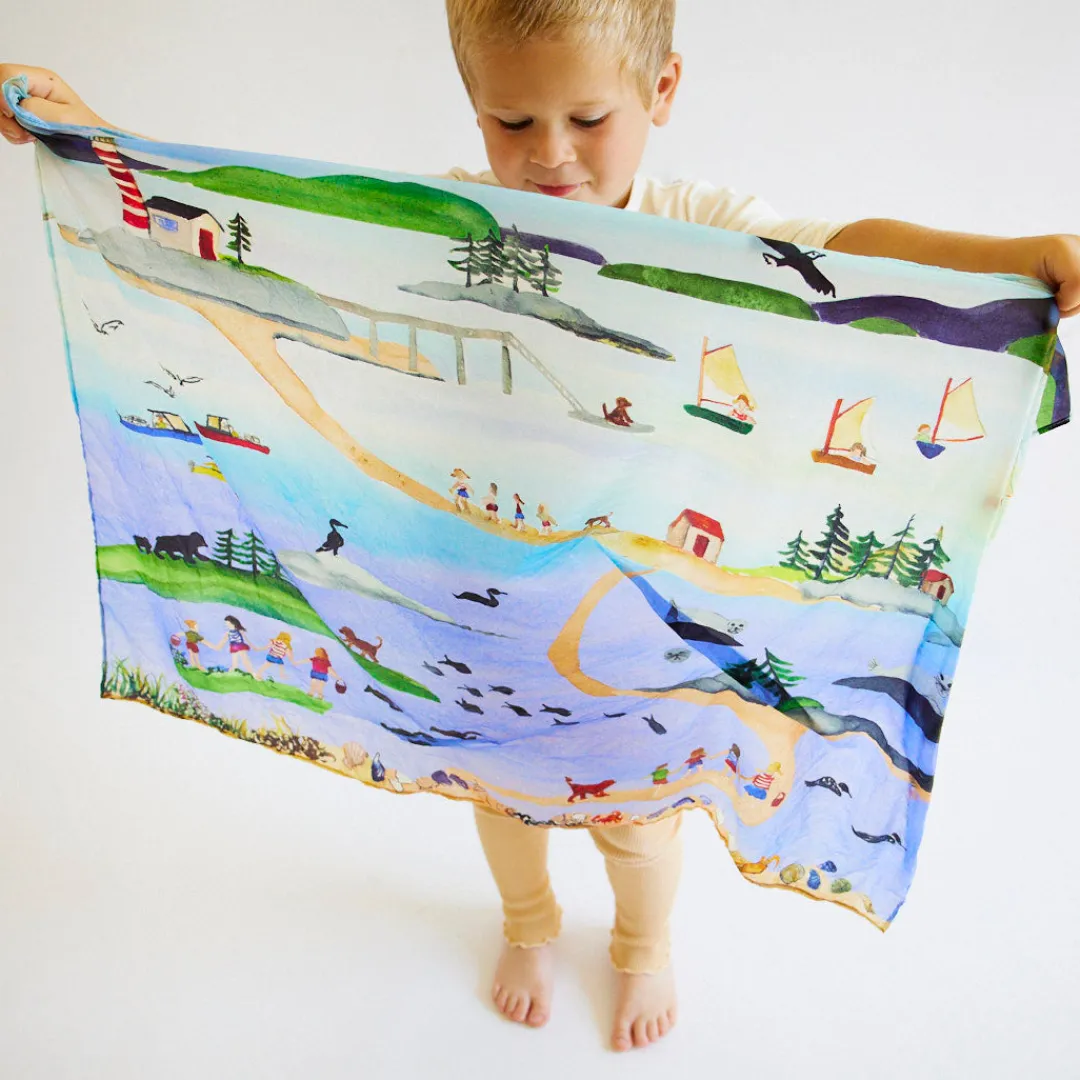 This NEW special limited edition Seek & Find Playsilk features scenes from Sarah’s childhood in Maine, brought to life with beautiful illustrations from her mother, artist @MarciaStremlau.