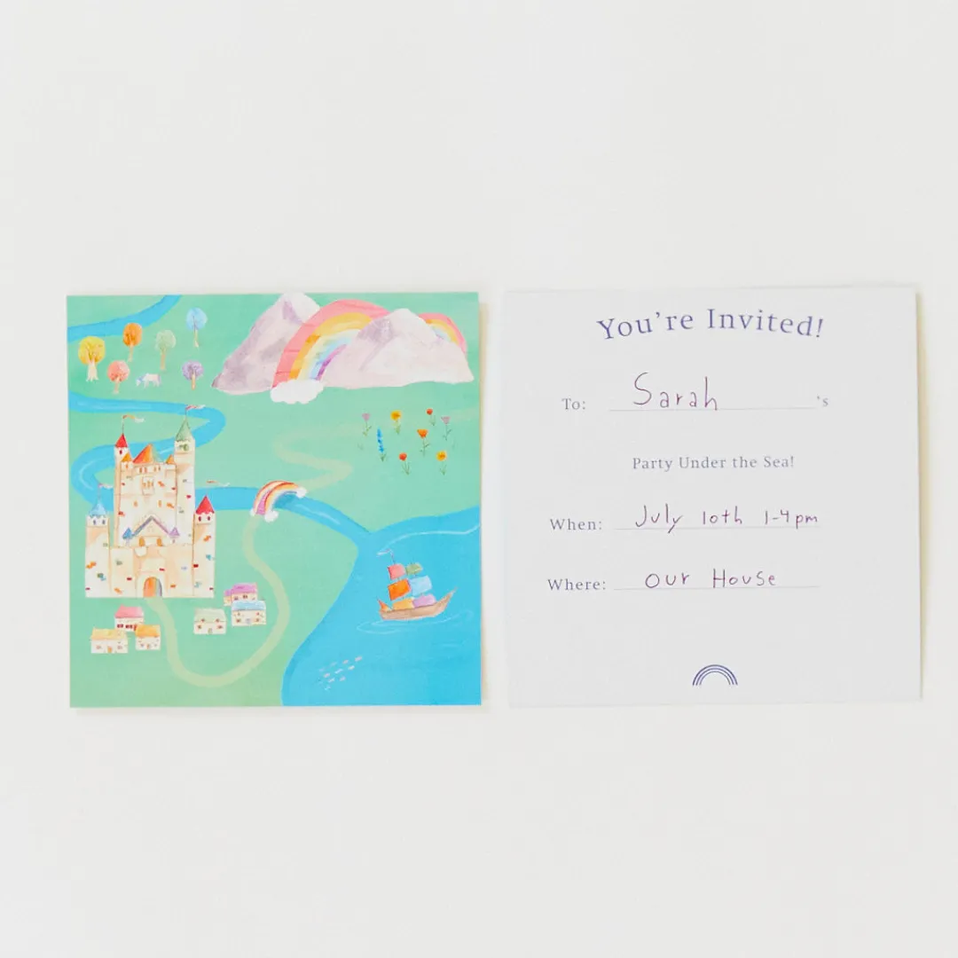 NEW Sarah’s Silks Party Invitations! Complete your little ones special day with beautifully illustrated party invitations! Featuring our best selling Rainbowland Playmap illustration, this set of invitations is perfect for rainbow themed birthdays!