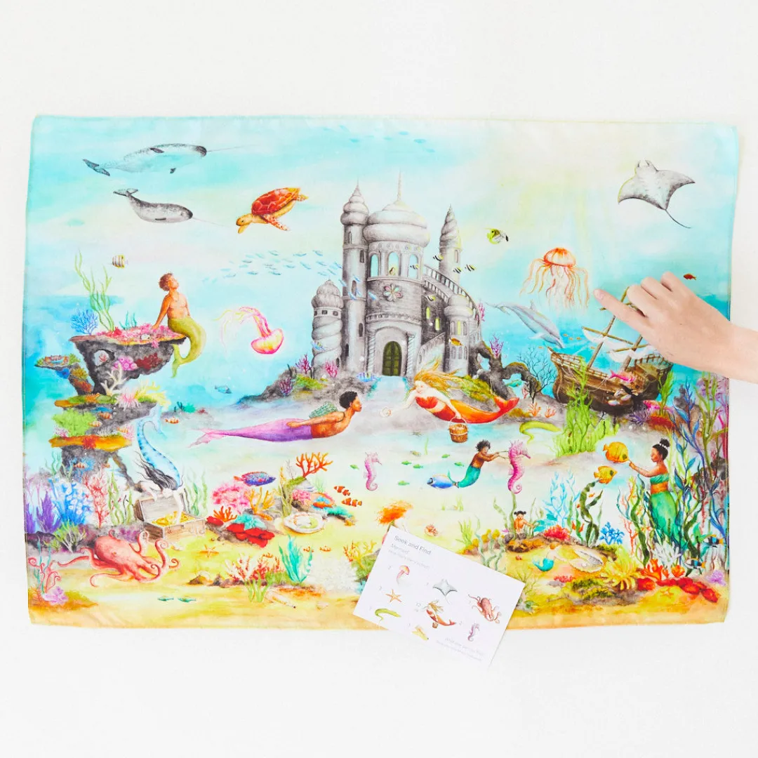 Seek & Find Playsilks are made in collaboration with different artists. The Mermaid Seek & Find Playsilk features original artwork by Mhairi Hellbrandt.