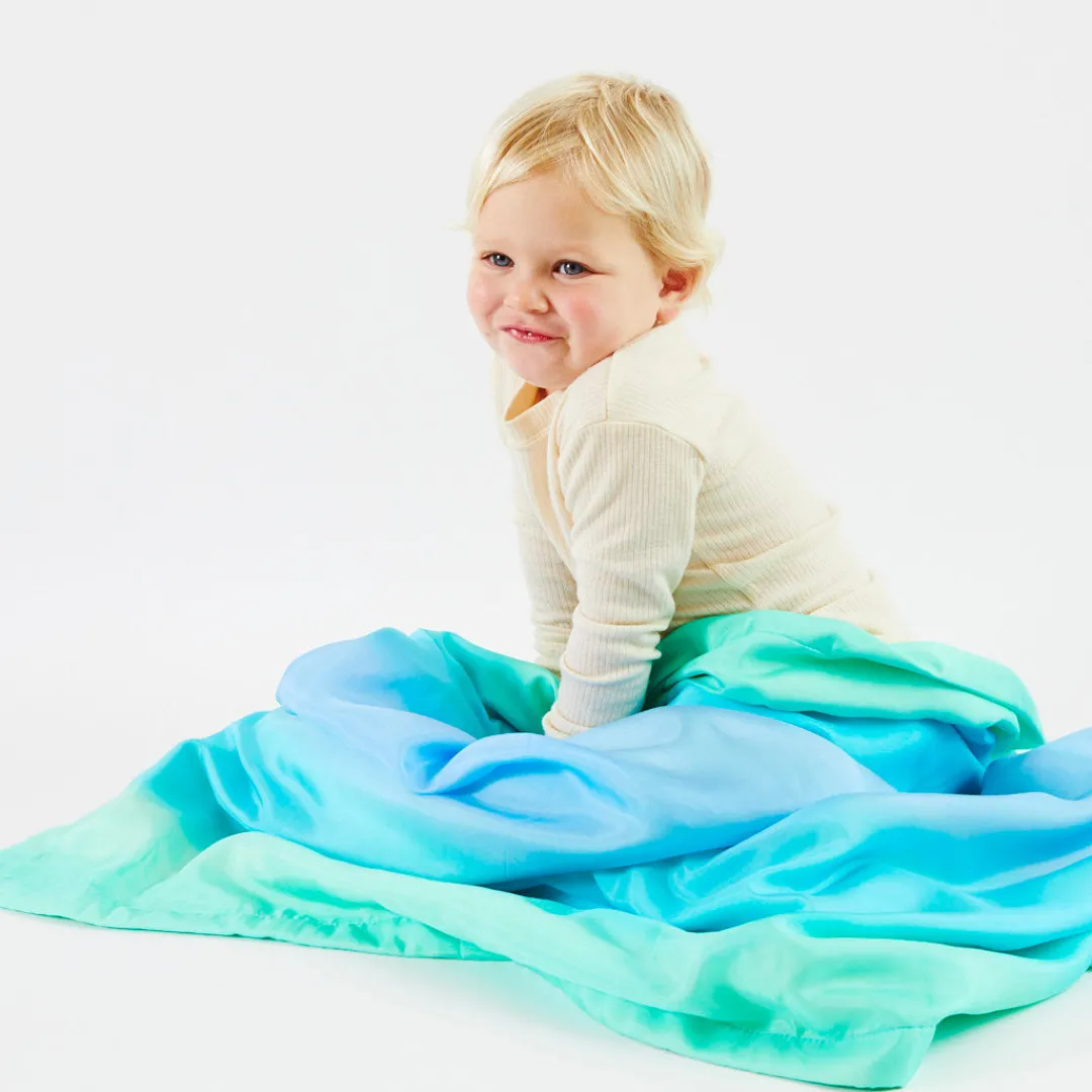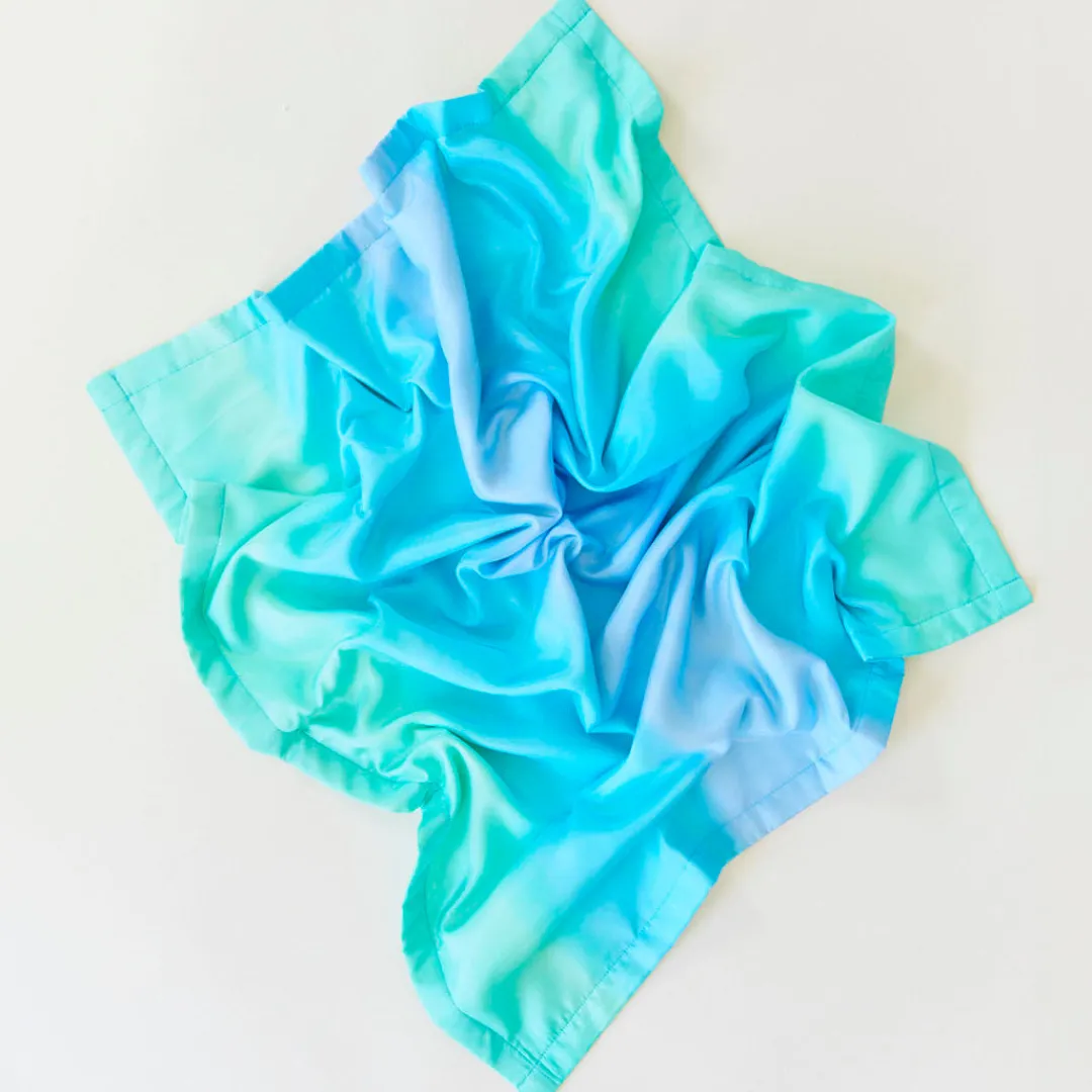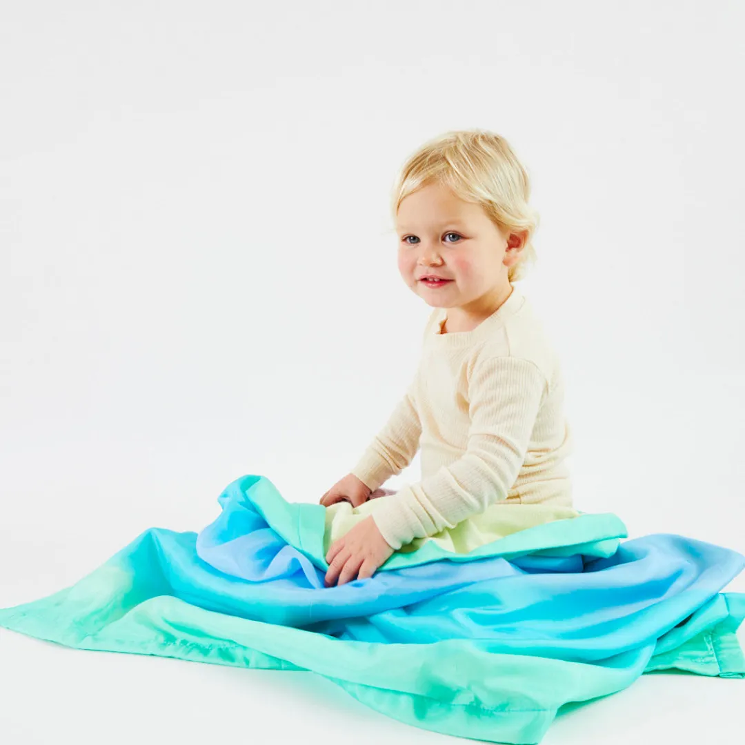 Sea Silk Baby Blankets measure 30 x 40-inches and are made from a layer of shimmering silk in our Sea colorway and a layer of yellow flannel. Lightweight, gentle, cozy, and designed to nourish your baby’s sense of touch. Perfect for keeping newborns up to toddlers comfortable in every season.
