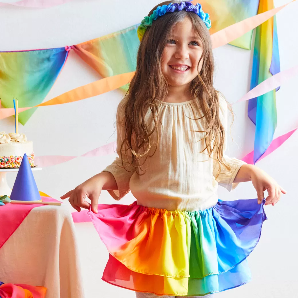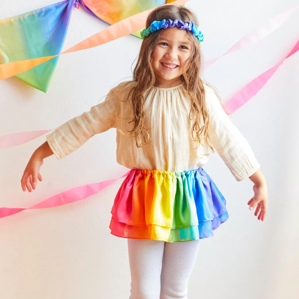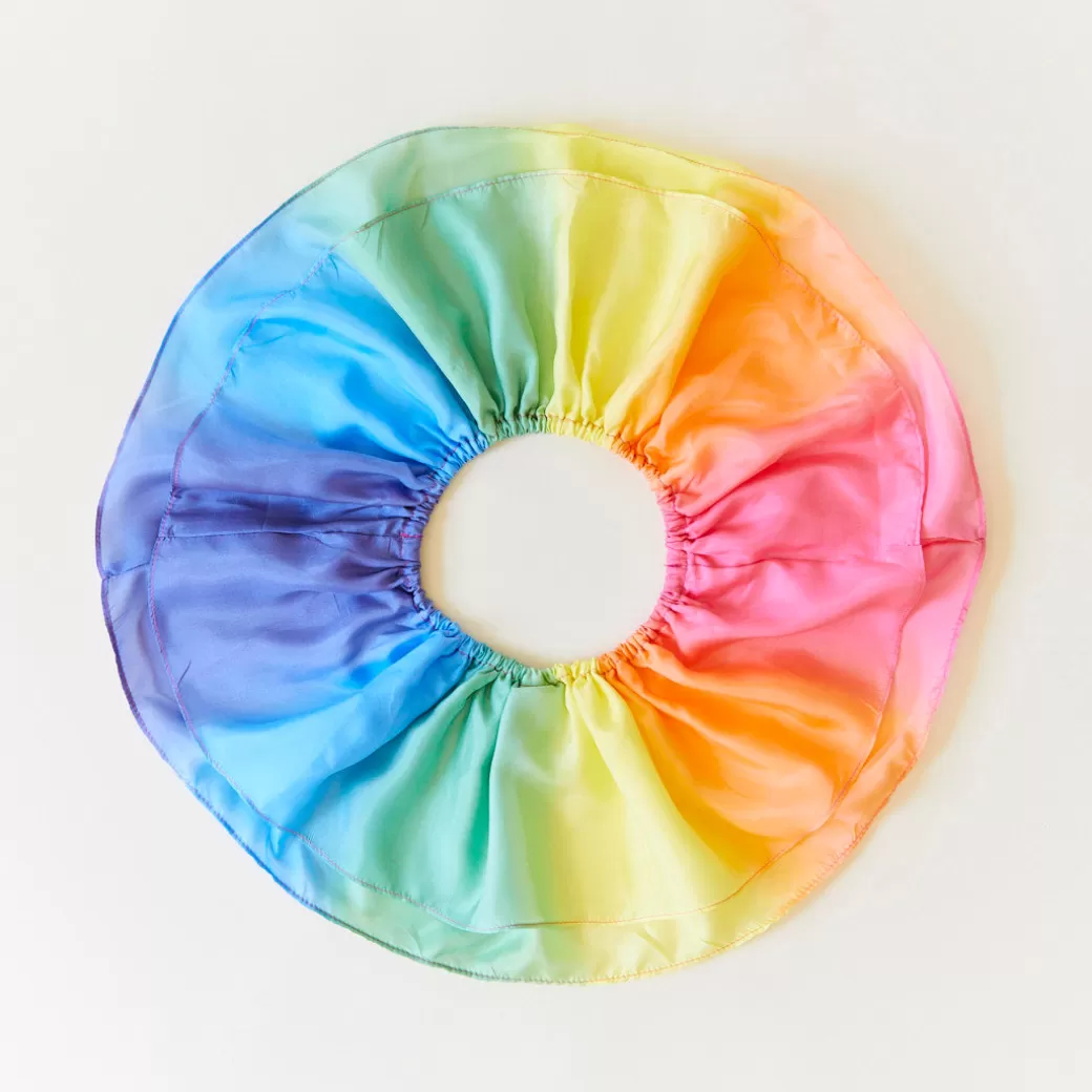 Rainbow Tutus have an elastic waist that stretches comfortably from 20 to 26 inches and are 8 inches in length, sewn with two layers of 100% pure mulberry silk, and hand-painted in our beloved Rainbow colorway.