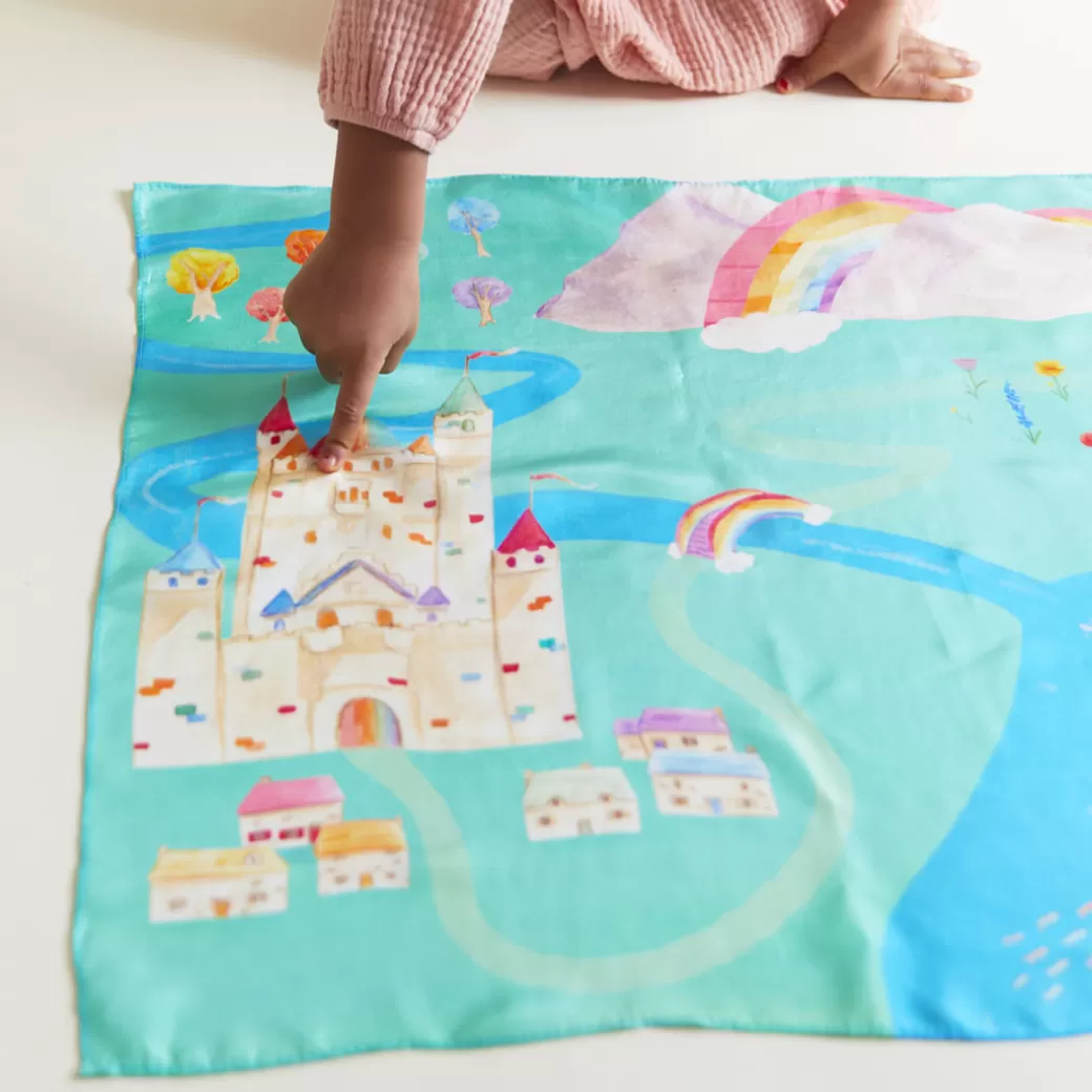 The Rainbowland Playmap is a 21×21-inch square made from gorgeous, heavyweight, 100% pure mulberry silk, and printed with non-toxic, earth-friendly dyes.