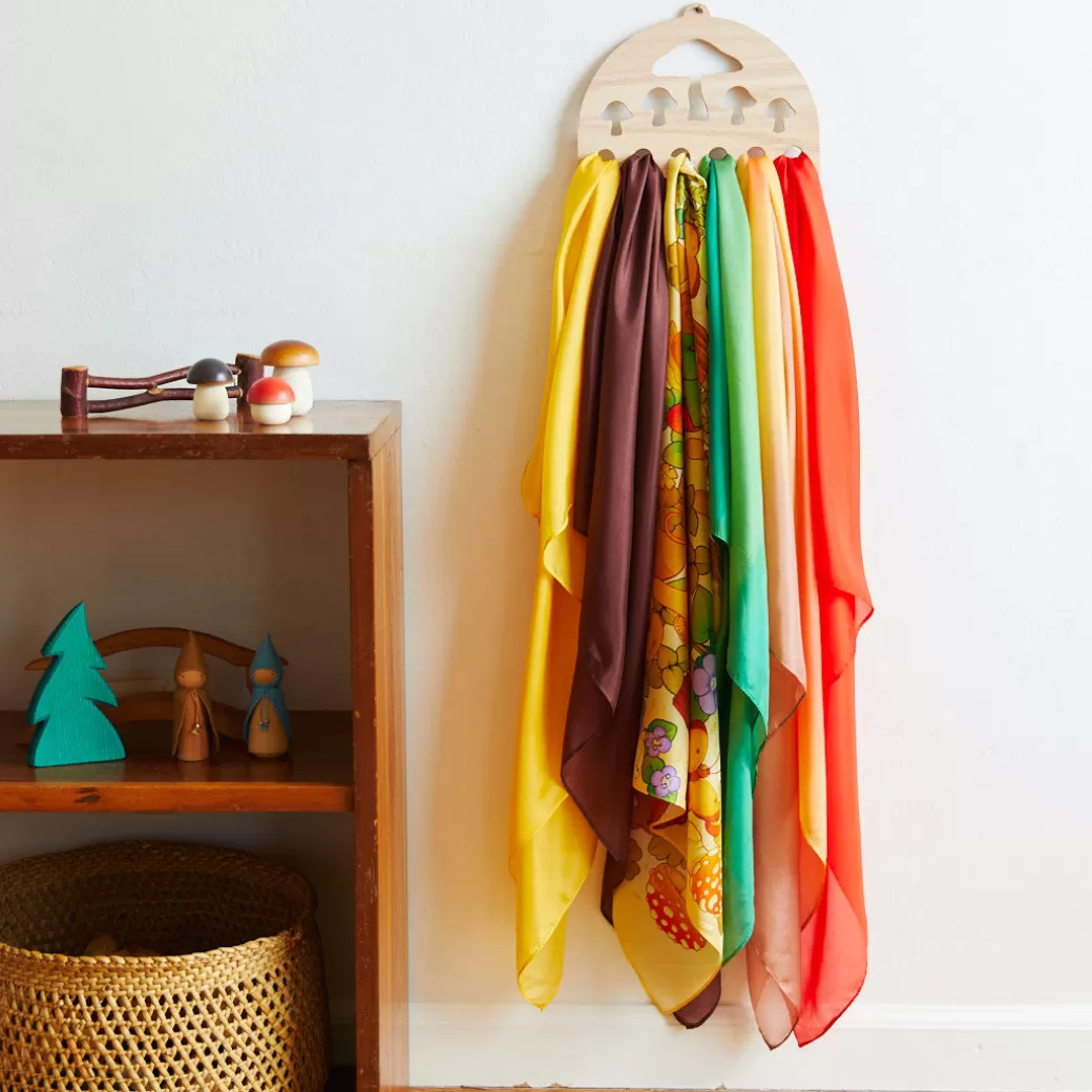 Beautiful display options for homes and classrooms. Simply hang on a wall and slip your Playsilks through! Easy and fun for children learning to care for their toys and encourages young ones to keep playrooms tidy.