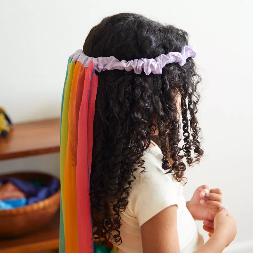Sarah’s Silks Veils feature a soft Georgette Silk draped from a silk garland adorned with matching ribbons. Children will pretend to be princesses, ghosts, genies, birds, and so much more!