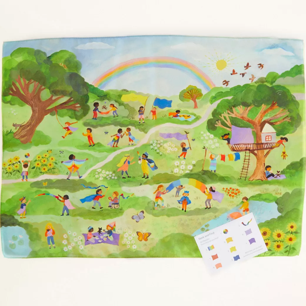 Seek & find your favorite open-ended toys and dress-up pieces and discover new play ideas along the way. This 22 x 29 inch Playsilk features original artwork by Gemma Koomen, showcasing each beloved toy from the magical world of Sarah’s Silks.