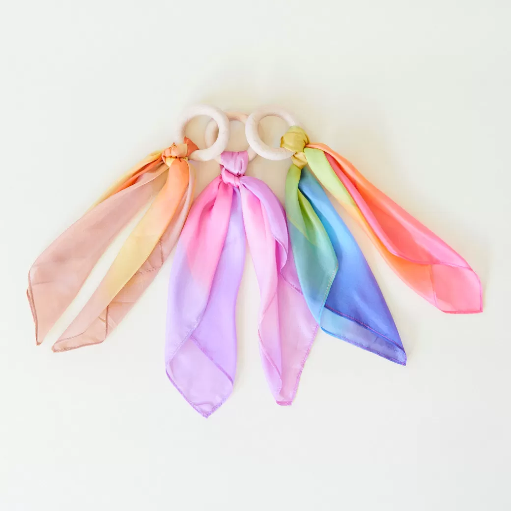 The Rainbow Baby Teether is a 3″ diameter solid Maple wood ring with a 21″ x 21″ Mini Rainbow Playsilk securely knotted onto it.