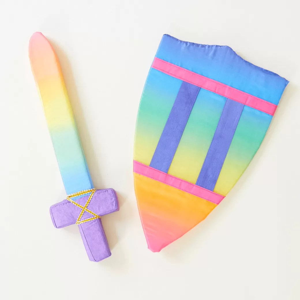 Rainbow Shields are made from soft but stiff foam and covered with pure mulberry silk in our bestselling rainbow pattern with purple silk handles on the back. They pair perfectly with our Rainbow Swords, Rainbow Crowns, and Rainbow Capes.